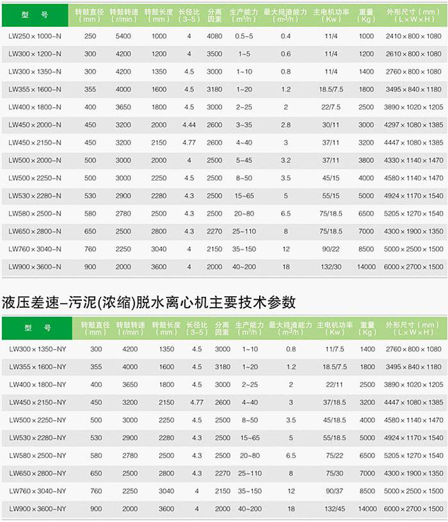 注:1.實(shí)際能力與物料性質(zhì)和分離要求有關(guān)。2.表中最大排渣能力是按△n=10r/min作雙向擠壓狀態(tài)下計(jì)算值。3.污泥脫水進(jìn)料濃度范圍0.5-6%。(具體濃度范圍視物料性質(zhì)而定)4.離心機(jī)與物料接觸部分采用優(yōu)質(zhì)不銹鋼制作,或根據(jù)用戶要求定。